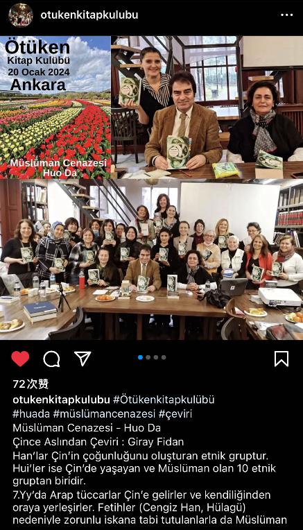 近日,由中國作家協會外聯部指導,中國圖書進出口(集團)有限公司和土耳其“中國文學讀者俱樂部”聯合土耳其于都斤 (?tüken)讀書俱樂部共同組織的《穆斯林的葬禮》讀書分享會在土耳其成功舉辦。于都斤讀書俱樂部負責人富阿特·亞卡爾、土耳其民俗學家納齊耶·恰基奇作為嘉賓參加活動并圍繞該書的文化背景、故事情節、哲學思想等進行分享。當地作家、文化藝術家和讀者等共40多人參加了此次活動。