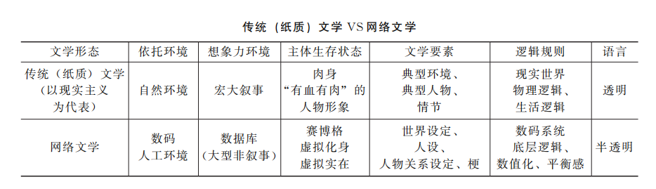 在“平行世界”的概念下,網絡文學自然獲得了與傳統(紙質)文學平等的地位。這是兩種不同的文學形態,它們的依托環境、想象力環境、主體(作者、讀者、作品人物)狀態、文學要素、文本內部遵循邏輯、語言等,都有明顯的不同。簡要列表如下: