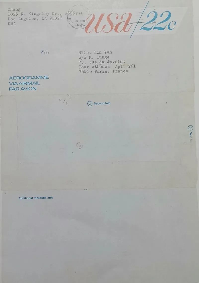 這三通張愛玲手札均書于信封和信紙合而為一的國際航空郵簡,張愛玲致宋淇、鄺文美夫婦較短的信件,也常使用這種航空郵簡。當時張愛玲已定居美國洛杉磯,手札寄出地址為: