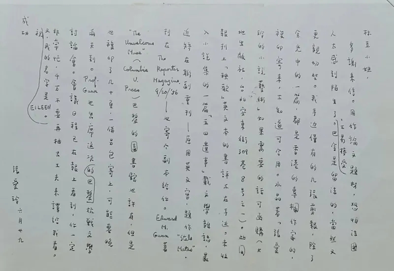 多謝來信。用作論文題材,恐怕法國人太感到陌生了,不易接受。巴金是留法的,當然又更親切些。我手邊僅有的幾張剪報,除了余光中的一篇,都是香港的專欄作家的,復印寄來,不知道可合用。水晶著《張愛玲的小說藝術》如果需要的話可函購(大地出版社,臺北安東街309巷8號之一)。此間報刊上《秧歌》英文本的書評不在手邊。未收入小說集的一篇《五四遺事》載《文學雜志》,最近將在《聯副》重刊——原用英文寫,題作Stale Mates,刊在The Reporter Magazine 9/20/’56——也寄個副本給你。Edward M. Gunn著The Unwelcome Muse(Columbia U. Press)巴黎的圖書館也許有,但是也復印了幾十頁,一并另包寄上,可能要晚兩天到。Prof. Gunn也出席這次巴黎的抗戰文學討論會。會議日程已在報上看到,你一定非常忙,千萬不要再抽出工夫來譯給我看。又,我的名字是EILEEN。