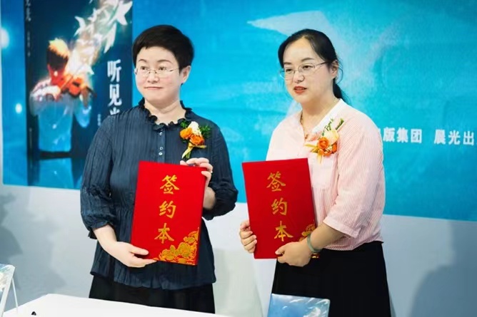 楊蔚婷、馬文莉代表晨光出版社和中國(guó)盲文出版社雙方簽署了《聽(tīng)見(jiàn)光》盲文版、大字版、有聲版、數(shù)字版出版合同。