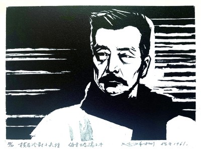 在此畫的構(gòu)思中,賴少其沒有一味地突出魯迅形象之高大而使之充塞整個畫面,而是將魯迅的頭像設計在小小的墨瓶上,與右側(cè)燃燒自己、照亮他人的蠟燭相呼應。賴少其在畫作中并沒有簡單地堆放書和筆這類塑造知識分子形象的常用物象,而是從自己對魯迅精神的理解出發(fā),充分發(fā)掘木刻藝術(shù)黑中見白的語言特質(zhì),采用以物喻人的方式塑造了魯迅為青年的進步甘為“一木一石”的形象,別具深度。