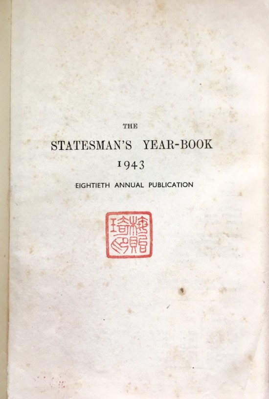2024年4月,我買到一冊(cè)殘破的英文舊書《1943年度政治家年鑒》(The Statesman's Year-book 1943),書名頁鈐朱文篆印“梅貽琦印”。《政治家年鑒》是英國(guó)歷史最悠久的政經(jīng)年鑒,始創(chuàng)于1864年,到今天仍在持續(xù)出版。1943年度的,為該年鑒第八十次刊行。《政治家年鑒》一般在當(dāng)年年初面世,而所載信息更新相當(dāng)及時(shí),如《1943年度政治家年鑒》有關(guān)中國(guó)部分,當(dāng)時(shí)國(guó)民政府的部長(zhǎng)名單,更新至1942年12月7日。全書厚達(dá)一千四百多頁,能維持這樣的更新速度,編纂能力是驚人的。這樣一部工具書,當(dāng)然是供人查閱,而非展讀的。不過,梅貽琦既鄭重鈐印,自己留存,想來還是覺得它有用處。梅貽寶回憶,1945年赴美前曾到昆明看望兄長(zhǎng)梅貽琦(按“大排行”,稱為“五哥”),在兄嫂家住了一夜:“臨睡前給我搭了張行軍床,借了條被,就設(shè)在五哥書架前……”(《5月19憶“五哥”》,收入《天南地北坐春風(fēng):家人眼中的梅貽琦》,石油工業(yè)出版社2018年9月版,72頁)梅貽琦家中有書架,證明藏書多少總會(huì)有一些,或許這冊(cè)《1943年度政治家年鑒》即在架上,也未可知。