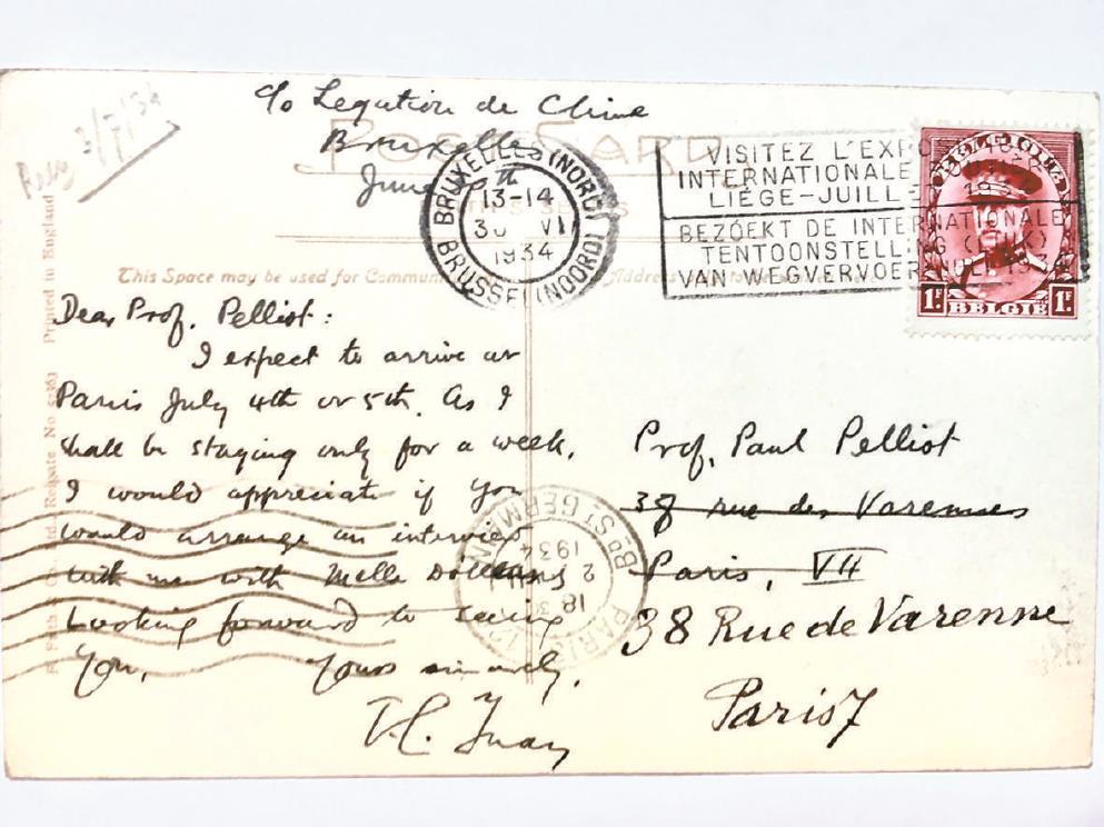 信件中也多有學術訪問交流活動的記錄。伯希和在1932—1933年、1935年到訪中國,停留了數月時間,在北平期間,不僅多方演講,并且頻頻參加筵宴。袁先生多次請伯希和餐敘,安排講座,并安排他在故宮博物院調閱意大利耶穌會士郎世寧的畫作。而先生為圖書館公務也多次出訪,我們在信件中可見到先生工作的繁忙。特別是先生在1934年、1945年兩次訪問歐洲,考察圖書館事業,其中1934年這次停留時間最久,6月至11月間訪問了比利時、法國、德國、奧地利、英國、西班牙、意大利等國的圖書館,并赴西班牙參加學術會議,多次在巴黎與伯希和見面。1934年7月訪問巴黎時,還與后來到平館做交換的杜乃揚(Marie-Roberte Dolléans,1911—1972)小姐見面。先生到訪的城市包括布魯塞爾、巴黎、柏林、維也納、倫敦、馬德里、佛羅倫薩、羅馬,在羅馬期間,很可能與羅馬大學漢學教授華嘉(Giovanni Vacca,1872—1953)晤面。抗戰期間由于局勢的原因,先生和伯希和的通信較少,存留的信中可見先生控訴日本帝國主義對中國圖書事業的摧殘,呼吁法國對中國圖書館的支持。這些通信為我們了解先生的學術活動提供了許多新的信息。