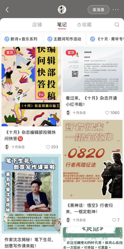 其實(shí),在近兩年的雜志宣發(fā)工作中,小紅書正是《十月》的一張亮眼名片。自2023年夏天創(chuàng)設(shè)以來,“十月雜志”小紅書號(hào)始終以輕松、活潑的形式推送文學(xué)作品和文壇訊息,運(yùn)營(yíng)一年內(nèi)粉絲數(shù)已經(jīng)超過1.8萬,打造了多篇爆款推文,并于2023年年底榮獲“第九屆年度書業(yè)營(yíng)銷推選”最受歡迎新媒體賬號(hào)。在專題策劃方面,我們首創(chuàng)推出了“文化探店系列”——以短視頻的形式帶領(lǐng)讀者線上“種草”全國(guó)各大城市的特色書店,比如北京的萬圣書園、三聯(lián)韜奮書店、涵芬樓書店,南京的先鋒書店等,為讀者探尋精神食糧。執(zhí)行主編季亞婭認(rèn)為,作為傳播載體的文學(xué)期刊有其獨(dú)特的媒介屬性,它介于圖書出版和報(bào)紙傳媒之間,比圖書周期更短、能夠更加靈活地組稿,較報(bào)紙周期更長(zhǎng)、能夠承載更具深度的內(nèi)容。而小紅書是近幾年來廣受年輕受眾歡迎的新媒體,也已經(jīng)是中文互聯(lián)網(wǎng)最便捷的資訊搜索、傳播工具之一,我們可以最大限度地利用其媒介屬性和特點(diǎn),以辦報(bào)紙的意識(shí)來運(yùn)營(yíng)新媒體,及時(shí)關(guān)注文學(xué)圈各種最新資訊,將其呈現(xiàn)給受眾用戶。