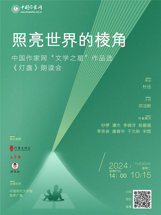 10月15日,中國作家網文學直播間舉辦了“中國作家網‘文學之星’作品選《燈盞》朗讀會”的直播活動。特邀《詩選刊》主編、批評家桫欏,魯迅文學院教研部副主任譚杰,北京電影學院副教授、青年詩人李嘯洋,魯迅文學院教師、青年詩人楊碧薇,《文藝報》編輯、青年評論家康春華,《當代》文學雜志編輯、青年作家于文舲,《燈盞》作者代表宋煜,以及中國作家網編輯、青年作家李英俊,以“照亮世界的棱角”為主題,結合當下文學熱點與具體的文學作品,從選稿與創作、點評與閱讀、出版與傳播等角度展開交流。活動還邀請有聲廣角工作室的朗讀者朗誦《燈盞》中的部分作品,以聲情并茂的朗誦走進文學作品,領略文學魅力。活動由中國作家網編輯鄧潔舲主持。