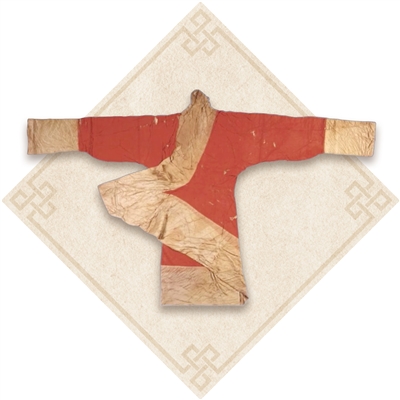 湖南長沙馬王堆一號墓出土朱紅菱紋羅絲綿袍,中原曲裾樣式代表。