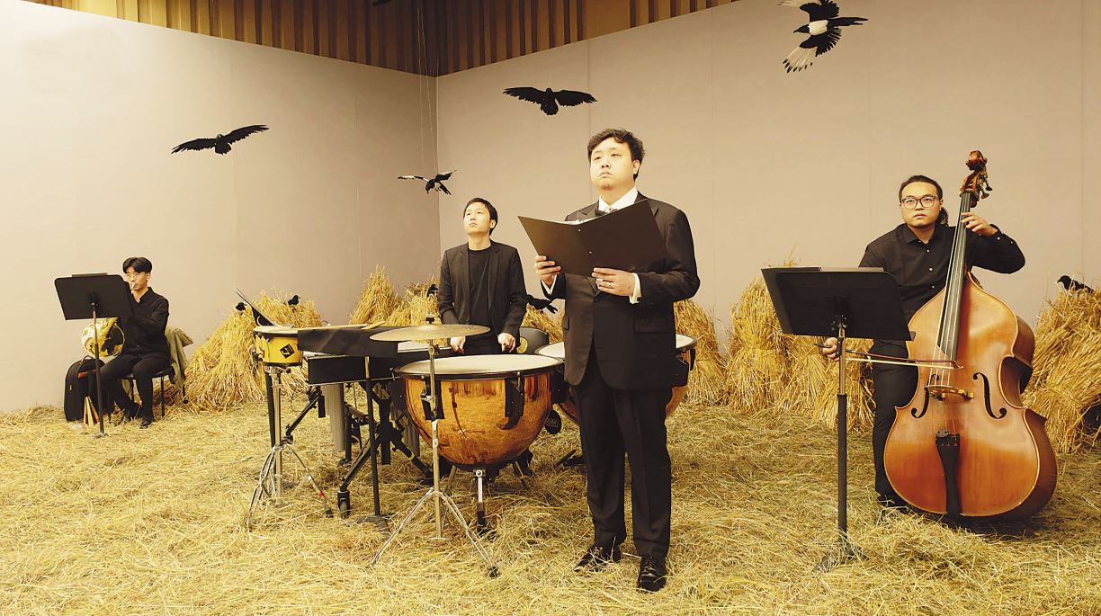 該劇由序和上、下半場三個單元結構而成。器樂部分為首席小提琴范曉界率大華室內樂團,同琵琶、古箏、匏笙及巴揚15人聯陣,聲樂部分為女高音孟越、女高音劉倪汝,和男高音徐偉欽、男低音楊熠4位協作。崔媛媛擔任指揮。有人說這不是歌劇,無非因為該劇沒有具體的角色分配與人物身份。而筆者以為,這是賈國平的“主觀故意”。演員和樂師承擔起一個或一群“角色”以傳遞作曲家對魯迅原著的個體理解與獨特表達,舞臺上的《野草》力圖藝術化、形象化地展現魯迅的思想情感和言論作為。