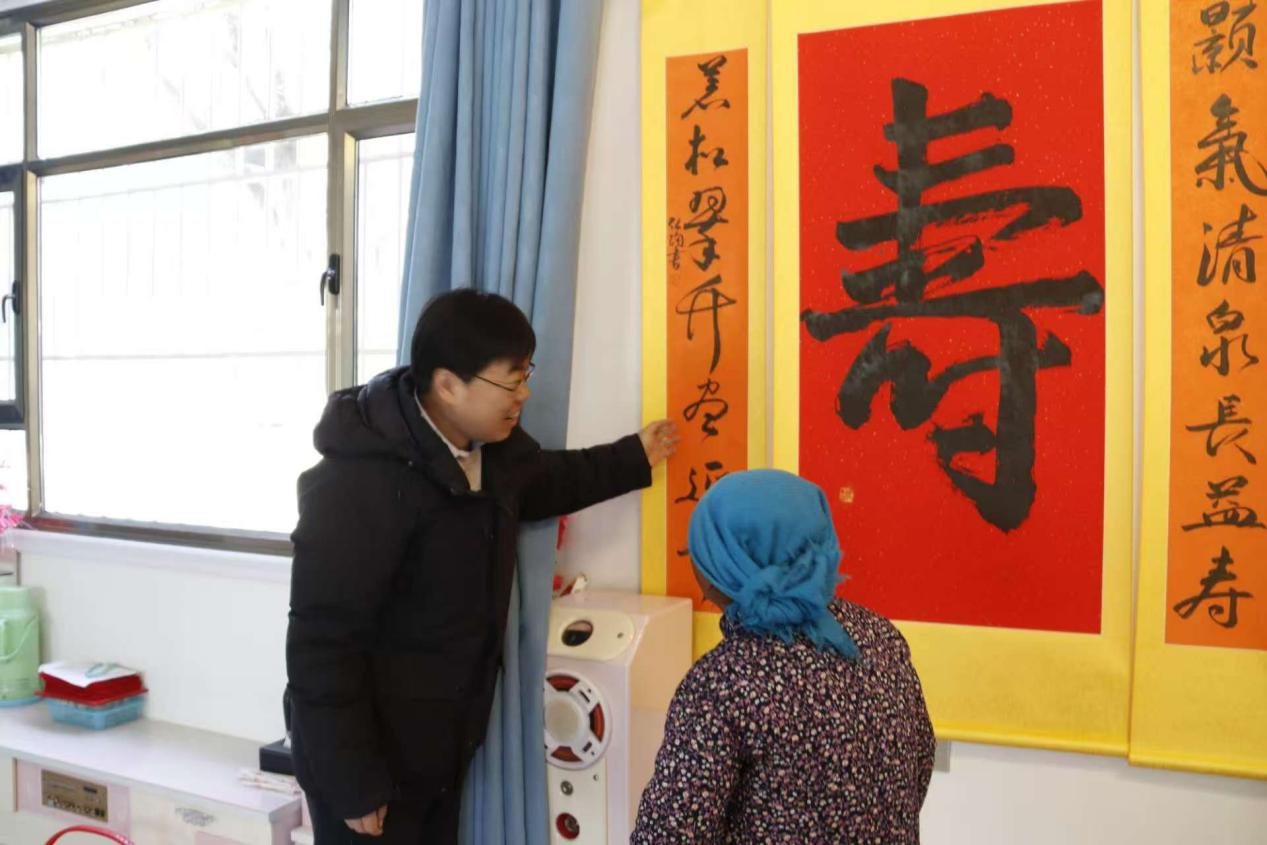 送春聯活動結束后,池溝村黨支部組織走訪慰問村內八十周歲以上老年人,為他們送去書法名家創作的中堂壽聯和米、油等生活用品。每到一戶,走訪人員都與老人傾心交談,陪他們嘮家常,關切詢問老人的日常生活、健康狀況,并和家人共同把中堂壽聯掛好,向老人介紹中堂壽聯創作及作者情況,轉達來自千里之外的祝福,為老人祝壽添福,以詩詞壽聯、中堂書法獨特的文化韻致,德化人心、滋養家風,傳揚尊老敬老愛老的傳統美德。