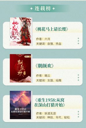 本期“悅讀連載榜”上榜作品題材多元、類型豐富,其中六月的《桃花馬上請長纓》已改編為短劇并頗關注;此外,曉云的重生復仇權謀作品《朝顏歡》讓讀者在體驗角色成長與逆襲的過程中,享受到了酣暢淋漓的閱讀快感;而妖道無涯的《重生1958:從窩在深山打獵開始》則開辟了一條充滿冒險與生存智慧的新敘事之路,為讀者帶來了全新的閱讀體驗。