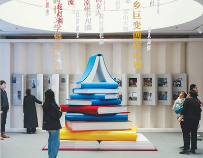 步入“歌以詠志 星漢燦爛——新時代文學成就展”展廳,書山模樣的藝術裝置矗立展廳中央。