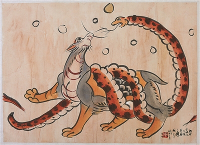 墓葬壁畫為了解古代社會提供了珍貴的圖像材料。礦物質(zhì)顏料繪制的壁畫顏色經(jīng)久不褪,畫中的蛇或出現(xiàn)在神話傳說場景里,或與人間煙火相伴,反映了古人豐富的想象力和精神信仰。山西忻州九原崗北朝壁畫墓中發(fā)現(xiàn)了鳥銜蛇和神獸銜蛇的圖案,象征著驅(qū)除升天途中的邪障,護佑墓主順利升天。《山海經(jīng)》記載:“大荒之中,有山名曰北極天柜,海水北注焉……又有神,銜蛇操蛇,其狀虎首人身,四蹄長肘,名曰強良。”銜蛇圖出現(xiàn)在墓葬中,也有鎮(zhèn)守墓室、庇護墓主人安寧的意義。山西右玉寶寧寺明代“大威德焰發(fā)德迦明王”水陸畫中的蛇形象與神佛相伴,庇佑人間。蛇在畫中不僅是一種裝飾,更體現(xiàn)了古人的精神寄托,希望借助蛇的神秘力量驅(qū)邪避災,保佑風調(diào)雨順、國泰民安。