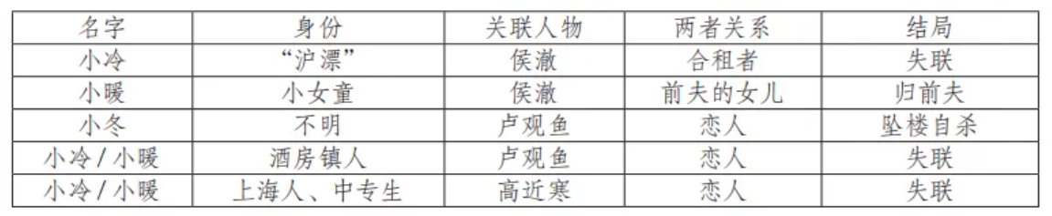 《嚼鐵屑》有一個引人注目或說令人恍惚的現象,就是幾個女孩都叫小冷或意思相近的小冬。小冷們或被戀人私下喚作小暖,或自己改名為小暖,而那個本來叫小暖的小女孩表面柔弱其實陰郁。很顯然,這是甫躍輝的有意為之。如此一來,能指和所指的對應關系被打亂,確定性被不確定性所取替。由于小冷們涉及的人物和關系各有不同,略作整理如下:
