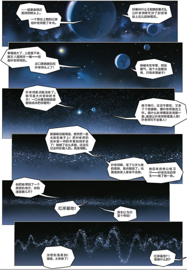 宇宙尺度由近至遠,通過兩頁圖就將葉文潔的過往都交待了