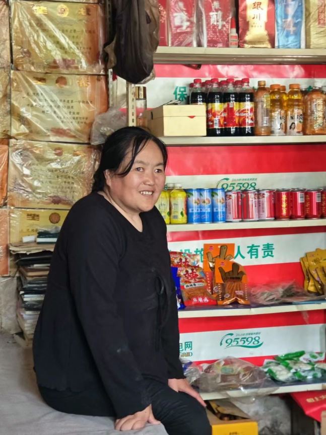 王對平在自家小賣部接受采訪,身后是一疊文學期刊和素材本
