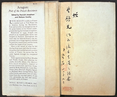 在施蟄存先生送給我的外文舊書中,有一本《Aragon: Poet of the French Resistance》(《阿拉貢:法國抵抗詩人》),Hannah Josephson和Malcolm Cowley編,紐約Duell, Sloan and Pearce一九四五年初版二刷。路易·阿拉貢是法國超現實主義詩人,二戰期間成為淪陷法國的地下抵抗運動領袖。書的前襯頁的左側,有施先生毛筆題詞:“贈望舒兄:作為流亡去港之紀念。弟蟄存,卅七年九月?!?/p>