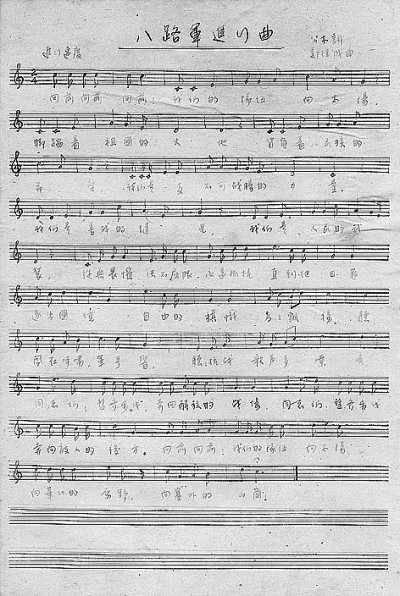 7月中旬,兩人抓住工作間隙,開始了這一宏偉的創(chuàng)作。公木首先完成《八路軍軍歌》歌詞,接著創(chuàng)作《八路軍進(jìn)行曲》歌詞。每寫完一篇,就交給鄭律成譜曲,只要鄭律成滿意便定稿。鄭律成則對(duì)每首歌曲提出獨(dú)特要求:《騎兵歌》要有馬蹄前進(jìn)的嘚嘚聲,《炮兵歌》要有震天響的氣勢(shì),《八路軍進(jìn)行曲》要長(zhǎng)短相間、寓整于散、韻律和諧、節(jié)奏響亮,中間還要插入三個(gè)四字短句,公木都一一照做?!栋寺奋娺M(jìn)行曲》原詞開頭就是“我們的隊(duì)伍向太陽(yáng)”,鄭律成作曲時(shí)加了“向前!向前!向前!”3個(gè)短句,極富號(hào)召力量。
