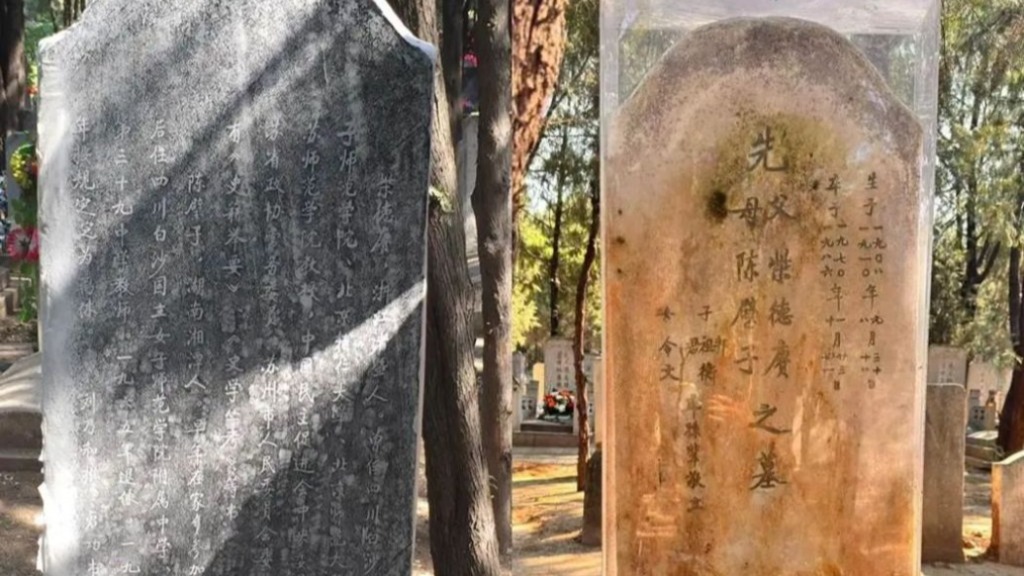 圖三 2016年正在為柴德賡、陳璧子墓拓碑(左);加裝玻璃罩后(右)