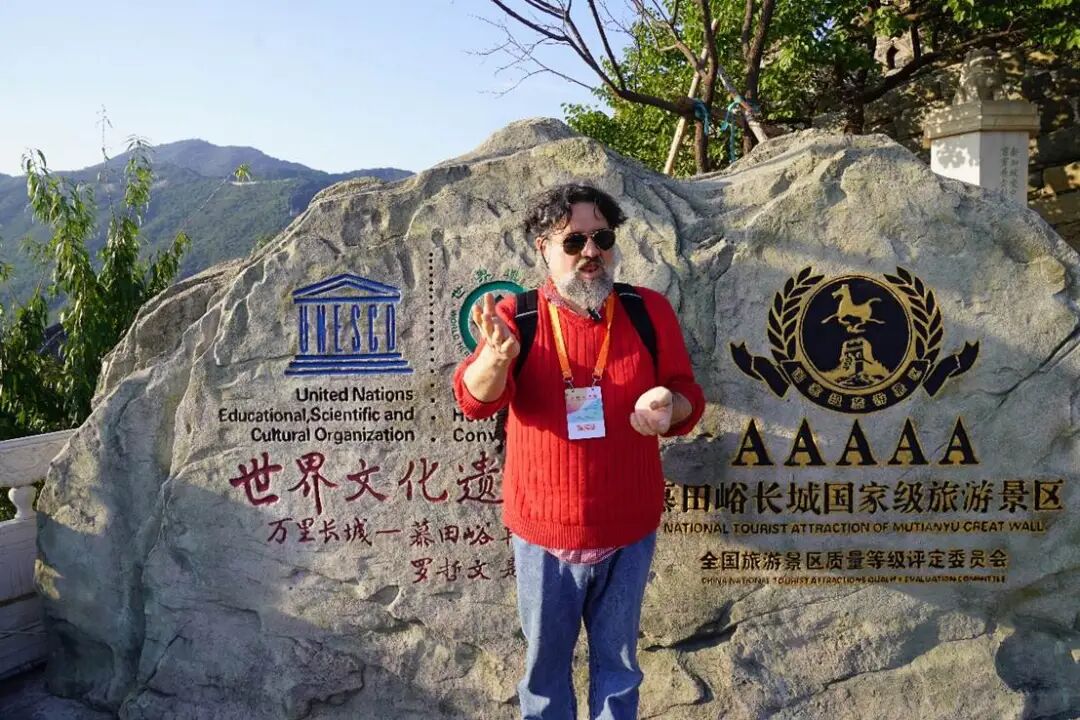 傍晚漫步慕田峪,夕照將整段長城點染成金色,遠處層層疊疊的松濤和近處烽火臺的剪影一同激活了史詩的聲音。身臨此地,阿根廷詩人馬克西米利亞諾·萊尼亞尼心中激蕩著難以自抑的澎湃情感。他說,長城是他窮盡一生夢寐以求的少數幾個地方之一,自收到中國之行的邀請函起,他便不斷追問這個抵達長城的夢想何時能成為現實。而今,夢想終于成真,馬克西米利亞諾·萊尼亞尼感受到了這片土地上散發的能量、呼吸的歷史,他認為,這完全詮釋了“史詩”的真諦——“人類歷史上所有史詩創作都以此為源泉。此刻我們既能追思中國詩人的瑰麗詩篇,也能遙想阿根廷詩人書寫東方傳奇的壯美文字。”在長城上,馬克西米利亞諾·萊尼亞尼和中外詩人們從荷馬史詩聊到博爾赫斯,尤其是后者,這位被拉美、中國乃至全世界作家反復引述的文學巨匠,正是他最早用中華文明的史詩意境與源遠流長的神秘魅力,為阿根廷讀者開啟了認知的窗扉。“今日,我終于得以親身體驗這份傳奇。”馬克西米利亞諾·萊尼亞尼說道。