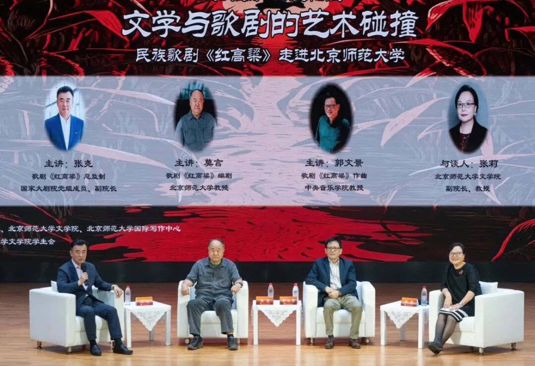 9月19日晚,國家大劇院“經(jīng)典藝術(shù)講堂”攜手歌劇《紅高粱》主創(chuàng)來到北京師范大學(xué)。國家大劇院黨組成員、副院長、歌劇《紅高粱》總監(jiān)制張堯,歌劇《紅高粱》作曲郭文景,編劇莫言與北京師范大學(xué)文學(xué)院副院長張莉進行了深入對談,與北京師范大學(xué)文學(xué)院的師生們共同探討歌劇《紅高粱》的制作緣由與改編特色,以及如何在文藝創(chuàng)作中講好中國故事、感受民族精神。