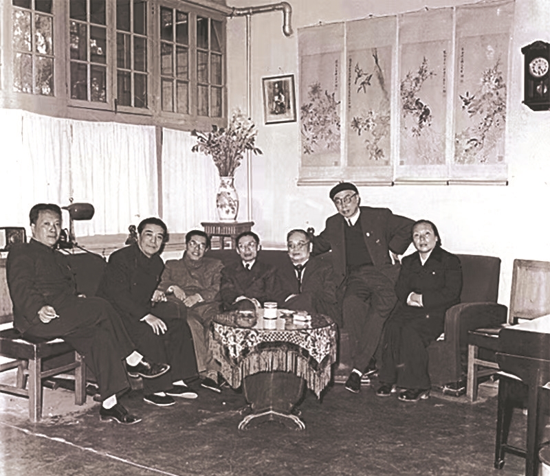 1960年,戲劇家們?cè)诒本堊灾衣窔W陽(yáng)予倩家中,左起:陳白塵、陽(yáng)翰笙、張庚、夏衍、歐陽(yáng)予倩、田漢、李伯釗