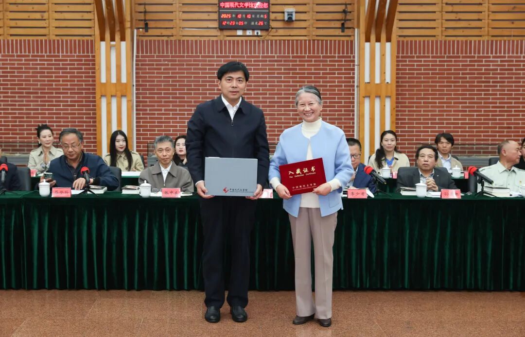 座談會上,鄭蘇伊代表臧克家親屬向中國現代文學館捐贈了1000余件手稿、實物,368本名家簽名贈書等珍貴文獻。畫家紀清遠、李培禹捐贈了畫作《詩人臧克家》。中國現代文學館常務副館長王軍接受捐贈,并頒發入藏證書。