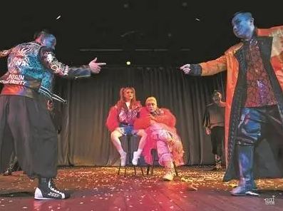 說到連接現實,就不得不提到《羅吉》的戲中戲設計。劇中的伶人戲班不再如《哈姆雷特》原著中那樣,僅僅演出了用于試探新王的《捕鼠器》。他們靠表演謀生,“什么掙錢就演什么”;他們把“鮮血、愛情和死亡”當作賣點,所有的表演都是為了滿足觀眾的獵奇心理與感官需求。舞臺上濃妝艷抹、奇裝異服、表演低俗的伶人戲班,與戲劇家格洛托夫斯基曾經批判的演員別無二致——他們的身體僅僅是獲利的工具,他們的表演也是虛假的技巧堆砌。