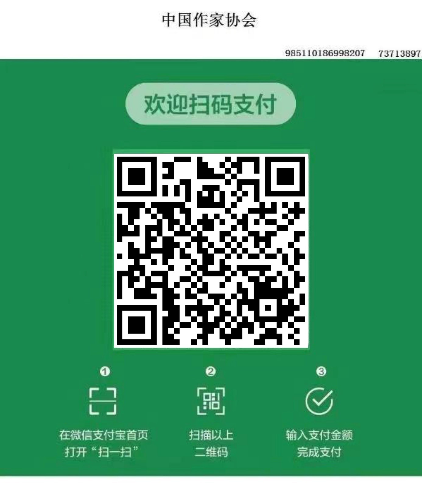 請(qǐng)掃描下方二維碼,通過(guò)微信或支付寶將會(huì)費(fèi)直接轉(zhuǎn)入中國(guó)作家協(xié)會(huì)銀行賬戶(hù)。