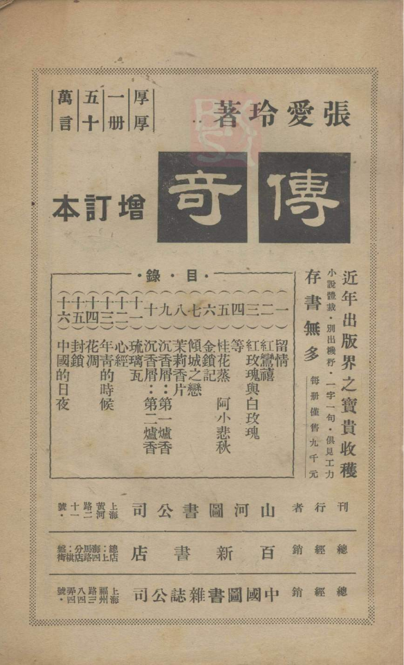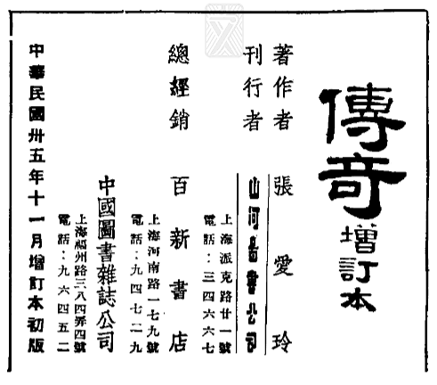 因此山河圖書公司確實是存在的,早在《傳奇》增訂本出版之前就已經開展業務了。結合上文所述,5月張愛玲考慮再版《傳奇》,只是在出版排印方面遇到了難題(舊版沒有了,重新印版太貴),8月則已經準備修訂《傳奇》的內容,這中間的轉折點我認為就是結識了龔之方和桑弧。