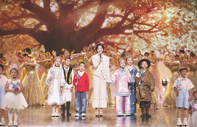 來自甘肅省甘南藏族自治州臨潭縣的6名小朋友與演員萬茜、芒果少年合唱團(tuán)共同演唱歌曲《最好的未來》 馮海文 攝