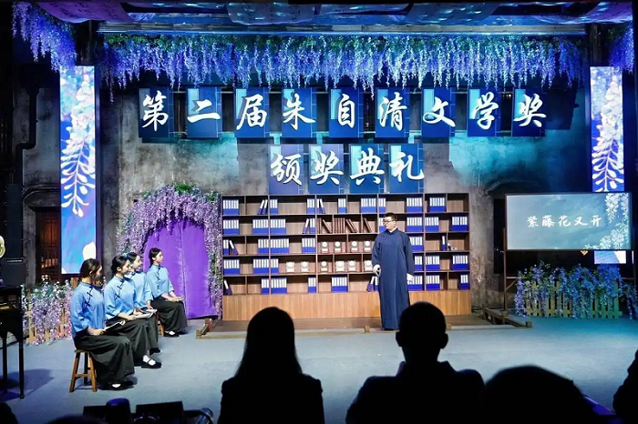 本次頒獎典禮以極具沉浸感的形式拉開序幕。隨著“各位客官,且入內——”的畫外音響起,百年前的大書場茶館場景仿佛重現,讓現場觀眾瞬間穿越時空,置身文學故事之中。行為表演《時光啊,你慢些走》勾勒出歲月流轉的詩意,引子《一堂課》則以情景再現的方式,還原了1922年朱自清先生在臨海執教時與學生探討新詩、暢談文學的場景。學生們對《毀滅》等詩作的好奇與追問,朱自清先生“一步步踏在泥土上,打上深深的腳印的深情吟誦,不僅展現先生與臨海的深厚情感,更傳遞出文學精神代代相傳的力量。