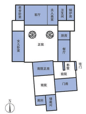 豐富胡同是一條南北走向的胡同,宅院位于路西,無法在南側開門,故而在院東側辟有一座小巧的磚砌門樓,入門可見一座磚影壁。門南有三間倒座房,供看門的工友居住。磚影壁西面是南院,內設平屋頂正房兩間,為家中男孩的臥室,白天兼作老舍私人秘書南仁芷的辦公室;正房對面的兩間小房,分別是廁所和儲藏間。