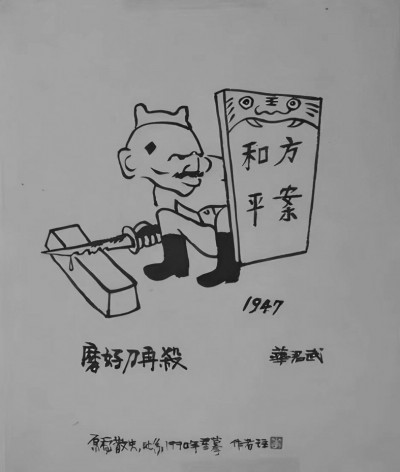 1942年5月,我參加了延安文藝座談會,聽了毛澤東主席的“講話”,我認識到,大眾化和民族化正是我漫畫中所缺少的,所以廣大人民群眾看不懂。怎樣解決這個問題呢? 首先要從語言上入手。我開始注意學習和運用老百姓的語言,用以指導我的漫畫創作。如《磨好刀再殺》,主人公蔣介石頭貼膏藥的形象是我創造的,廣大人民看了都懂。因此,這幅漫畫在當時產生了很大的影響。