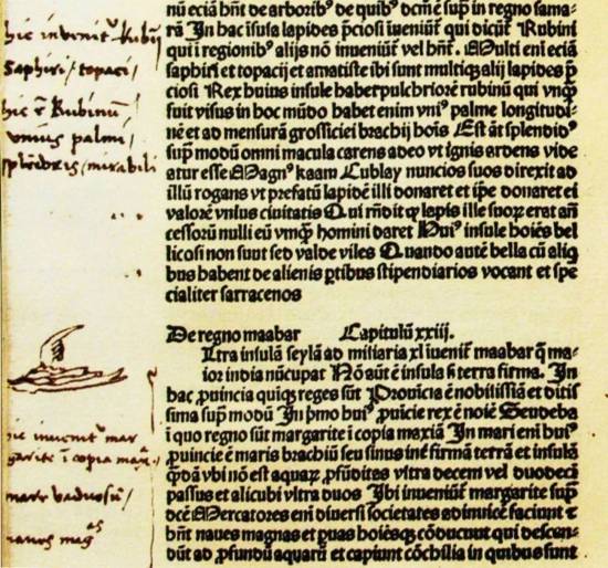 哥倫布在拉丁文《馬可·波羅游記》上所作的筆記。注意手指形狀的標記,表明應特別注意。