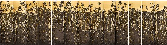 寧波美術(shù)館位于由甬江、姚江、奉化江匯聚而成的“三江口”北側(cè),200年來,這里都是一代代寧波人往來奔波的航運樞紐。因此,美術(shù)館完全按照當(dāng)年候船大廳的尺寸進行了重建,使得美術(shù)館的內(nèi)部空間極其高大,8米高的展墻有的用整面鋼鐵鑄就,有著極強的金屬質(zhì)感,能很好地烘托出“大作品”的雄渾氣勢,形成內(nèi)在的強烈呼應(yīng)。比如,此次展出的作品《共生會否可能》,就是最受觀眾歡迎的一個“打卡點”。這個裝置作品由1600根6米多高的金屬葵頭與蓮蓬頭組成,自2009年完成主體制作以來,已在北京的國博序廳、上海中華藝術(shù)宮的穹頂藝術(shù)中心、浙江美術(shù)館,以及德國德累斯頓市的博物館、萊茵河與摩澤爾河交匯的“德意志之角”等地展出。每次展出,不同的展呈形式都為這件作品賦予了新的生命與內(nèi)涵。此次展出,我以影像與音響為之構(gòu)建了一個共同的多重感知的藝術(shù)現(xiàn)場。展廳里,紅色的燈光打在這片“葵山”上,讓它既像濃霧中的一個巨大熔爐,又像一片著火的荒原,林立的銅葵與展廳立面三個巨屏里的活動影像以及鏗鏘作響的“鍛葵”的聲音交織在一起,展現(xiàn)了生命灼灼其華的生長與消逝,又似在這片葵園的濃霧中點燃了共生的渴望與某種偉大的遐想。還有“燎原”板塊展出的葵園油畫,它們一部分如長卷一樣大片橫呈在空間當(dāng)中,仰看四周廳壁,則是懸掛至5米高處的3米“大畫”,十分震撼。換一角度,從廳內(nèi)的復(fù)式二層向下看,這片“葵地”又好像正在無盡地生長,俯仰之間頗有種仰觀天地宇宙之大、俯察品類之盛,看萬物生長、爐火燎原的一派充滿生機的野性之美。