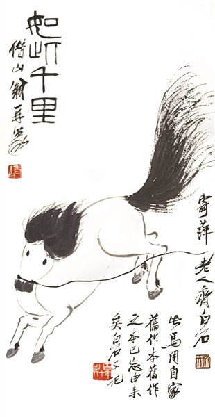 北京畫院研究員呂曉曾考證指出,到目前為止,尚未見到齊白石其他《十二屬圖》存世。齊白石一生創(chuàng)作,也有單幅作品表現(xiàn)鼠、牛、虎、兔、羊、馬、雞、狗、豬,但龍和蛇似乎僅見于這套《十二屬圖》中,因此關(guān)蔚山捐獻(xiàn)的這套完整《十二屬圖》堪稱“傳世孤品”,而《如此千里》作為其中的馬年代表作,更顯得彌足珍貴了。