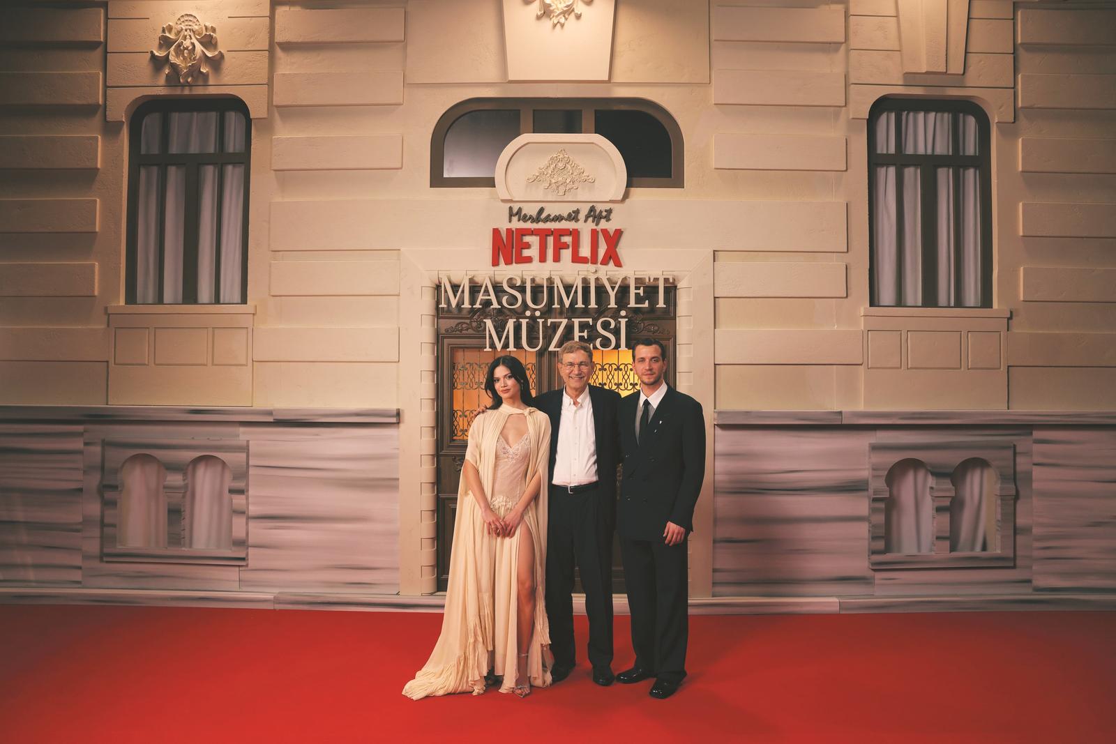 作家奧爾罕·帕慕克(中)和演員埃伊呂爾·坎德米爾(左)、塞拉赫丁·帕沙勒(右)共同出席了在伊斯坦布爾博斯普魯斯希爾頓酒店舉辦的土語電視連續劇《純真博物館》首映禮。該酒店也是劇中最重要的場景之一。片方圖片
