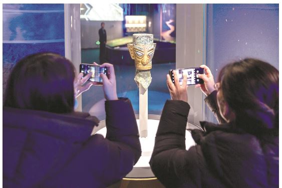 此次國博展覽亮點十足。首先是實現了歷史性聚首,三星堆博物館館藏與中國國家博物館館藏的戴冠縱目面具,時隔四十年首次同臺展出。還有青銅大立人、戴金面罩青銅人頭像、青銅龍柱形器、太陽神鳥金飾等珍貴文物悉數亮相。展廳的設計也獨具巧思,通過蜿蜒動線和漸變光影,營造出遠古詩意與神秘感。展覽還重點呈現2020年以來三星堆祭祀區新一輪考古發掘成果,吸納2025年9月三星堆論壇最新研究進展,既豐富了古蜀文明體系,也加深了公眾對中華文明多元一體格局的認識,為持續升溫的“文博熱”再添熱度。此外,策展團隊融入無障礙設計,設置盲文說明、可觸摸展品和NFC感應導覽,借鑒成熟場館經驗,調動觀眾多種感官,讓大家能多維度體驗古蜀文明,滿足不同觀眾的觀展需求。