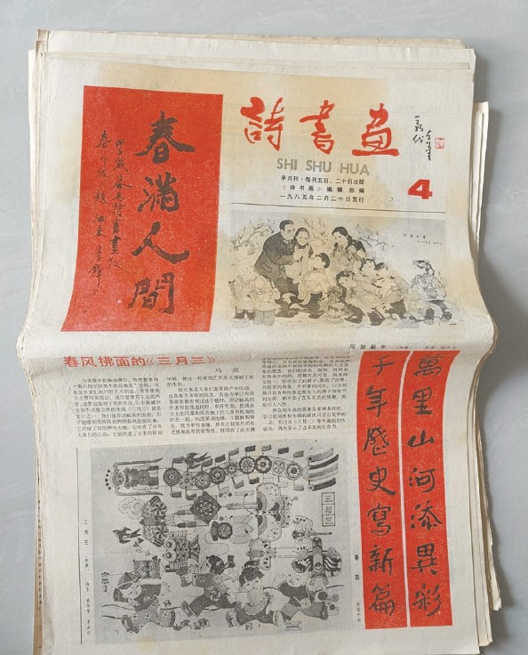 四開四版的小報,篇幅有限,正像四只小碟,如何配出各種花色的菜肴,是對廚師們的考驗。由黃苗子等任主編、曹辛之任執行主編的《詩書畫》的編者,是頗具匠心的。例如創刊號,四只碟子,各種菜點色香味俱全。詩有新體、舊體;畫有國畫、版畫、壁畫、漆畫、油畫、肖像畫;書法圖版則有五幀之多。此外,還有篆刻、題圖、尾花等等,豐富多彩,引人入勝。