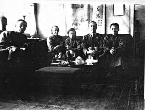 1934年,金岳霖、費慰梅、林徽因、費正清、梁思成(從左至右)在梁林北總布胡同家中客廳。