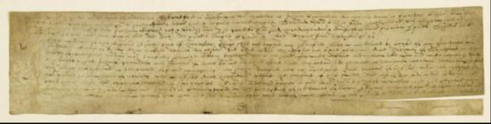 從外觀來看,這份契約與成千上萬份伊麗莎白一世時(shí)代的同類文件高度一致:以鵝毛筆書寫,采用當(dāng)時(shí)官方通行的秘書體,幾乎未使用標(biāo)點(diǎn)符號(hào);文件采用“雙尾標(biāo)簽制印法”(sur double queue),即把底部右側(cè)約半英寸寬的條帶向后翻折約5英寸,再將印章蓋于折痕處。如今所見手稿最下方右側(cè)的兩條切口,便是當(dāng)時(shí)羊皮紙標(biāo)簽(parchment tag)穿過留下的痕跡。
