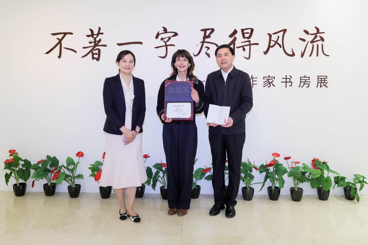 發布會前,蘇菲·瑪索參觀了中國現代文學館作家書房展以及中法交流珍品陳列,并向中國現代文學館捐贈簽名著作,中國現代文學館常務副館長王軍接受捐贈。