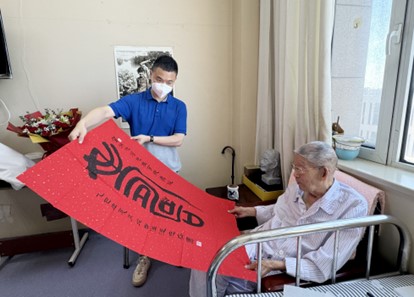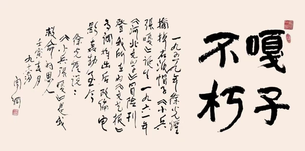 2025年7月5日,冒著近四十度的高溫,我到石家莊看望即將迎來百歲壽辰的徐光耀先生。出發前兩天,我琢磨擬了副賀壽聯:“筆燃烽火,嘎子英姿傳萬代;墨灑春秋,文壇巨擘壽期頤”,并請青年書法家鐘鏑揮毫寫就。進入醫院病房,精神矍鑠的徐光耀先生雙手合十歡迎我的到來,那份熱忱讓人心里暖暖的。