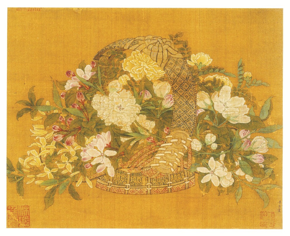 傳為南宋宮廷畫家李嵩作《花籃圖》春花冊用藤黃寫黃刺玫與連翹,明黃點點,與當季白碧桃、紫韻垂絲海棠、林檎等其他色彩的花卉相映,凸顯出春末百花盛開的蓬勃生命力。