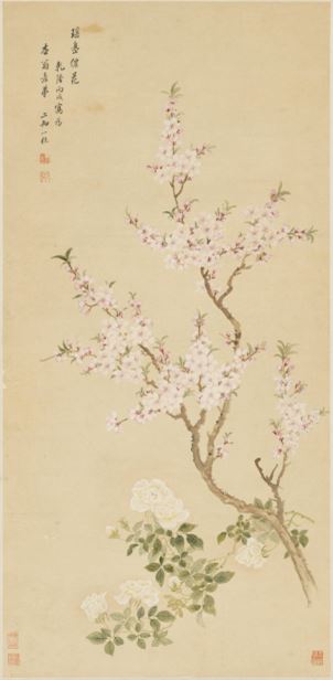 繼承惲壽平衣缽、將沒骨桃花再攀高峰的,是清代鄒一桂。其傳世的桃花作有《桃花圖》軸、《百花圖》卷等。《桃花圖》軸(北京故宮博物院藏),以胭脂為魂,繪出“千葉桃花勝百花”的春日盛景。畫中桃花,以重粉點瓣,再以胭脂淡淡罩染,濃淡交錯,層次分明;花苞以略濃胭脂點染,盛放花朵以淡胭脂輕暈,胭脂與白粉、赭石搭配得當。鄒一桂不刻意求工,唯求自然天趣,將北宋工筆的精致與元代寫意的灑脫融為一體,筆下桃花柔中帶剛,媚而不俗,既是對春光的描繪,更是對平淡超逸意境的追求。