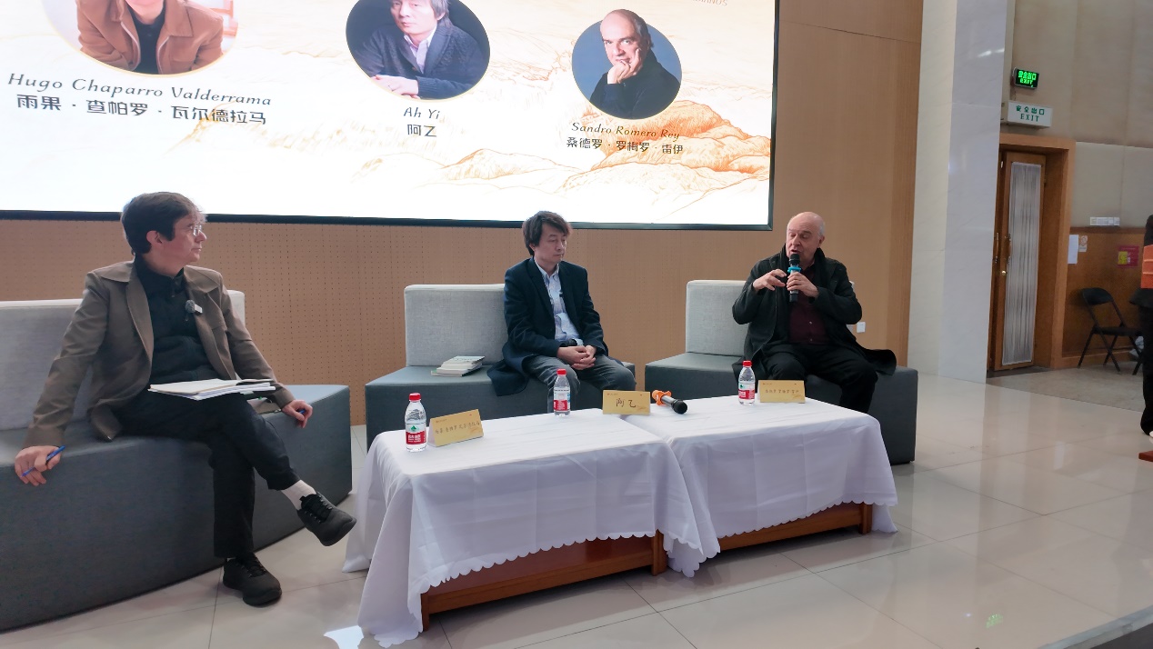 2026年4月14日,哥倫比亞作家雨果·查帕羅·瓦爾德拉馬、桑德羅·羅梅羅·雷伊來到首都師范大學,與作家阿乙圍繞“中哥作家筆下的青年命運與時代癥候”進行對談,來到現場的還有首都師范大學和古城中學的學生,古城中學的學生還獻上了精彩的西語表演。該活動由中國作協對外聯絡部、五洲傳播出版社、首都師范大學聯合主辦。