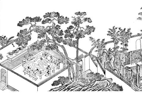 明代還有個特殊的流杯亭——“桌上曲水流觴”。當時著名的戲劇家汪廷訥于萬歷年間在安徽休寧建坐隱園,其名取自“坐隱手談”之意,既暗合圍棋雅趣,也寄托主人避世隱居、寄情山水的文人理想。在描述其園景的《環翠堂園景圖》里,有“桌上曲水流觴”圖,此曲水流觴并非自然溪流,也不是刻于地面上的水槽,而是將曲水的自然景觀微縮于桌案之上,在方寸之間重現蘭亭風骨,是明代文人將生活藝術化的極致體現。