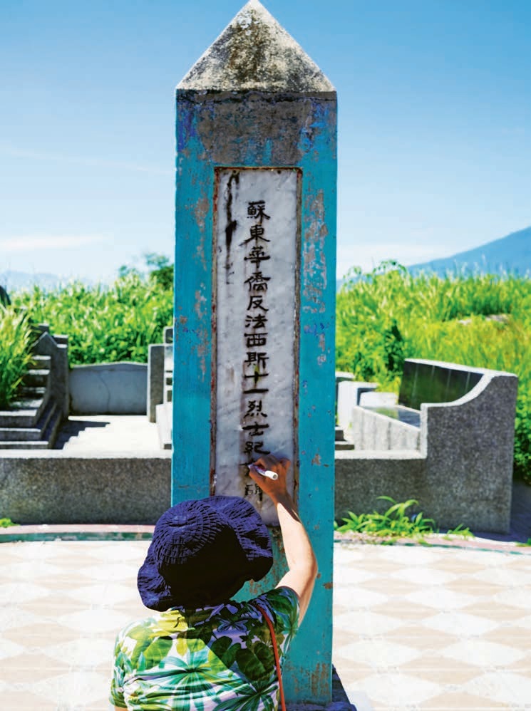 “蘇東華僑反法西斯十一烈士紀念碑”碑名已經掉色,胡舒立把15個鐫刻隸體字一一描寫了一遍。