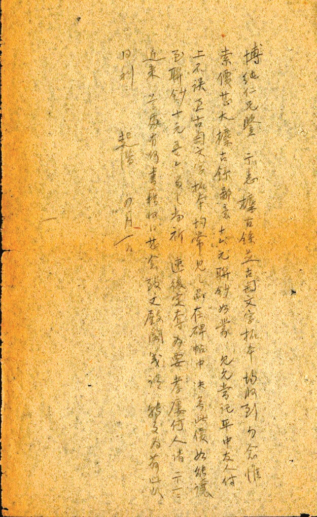 示悉。《攈古錄》并《古匋文字》拓本均收到,勿念。惟索價甚大。《攈古錄》鄙意十六元聯(lián)鈔,如蒙見允,當(dāng)托平中友人付上不誤。至《古匋文字》拓本均常見之品,在碑帖中絕無此價,如能讓至聯(lián)鈔十元,吾亦留之,尚祈速復(fù)定奪為要。孝廔何人,請示一二。近來尊處有何書籍收得,甚念。致文殿閣箋請轉(zhuǎn)交為荷。此頌